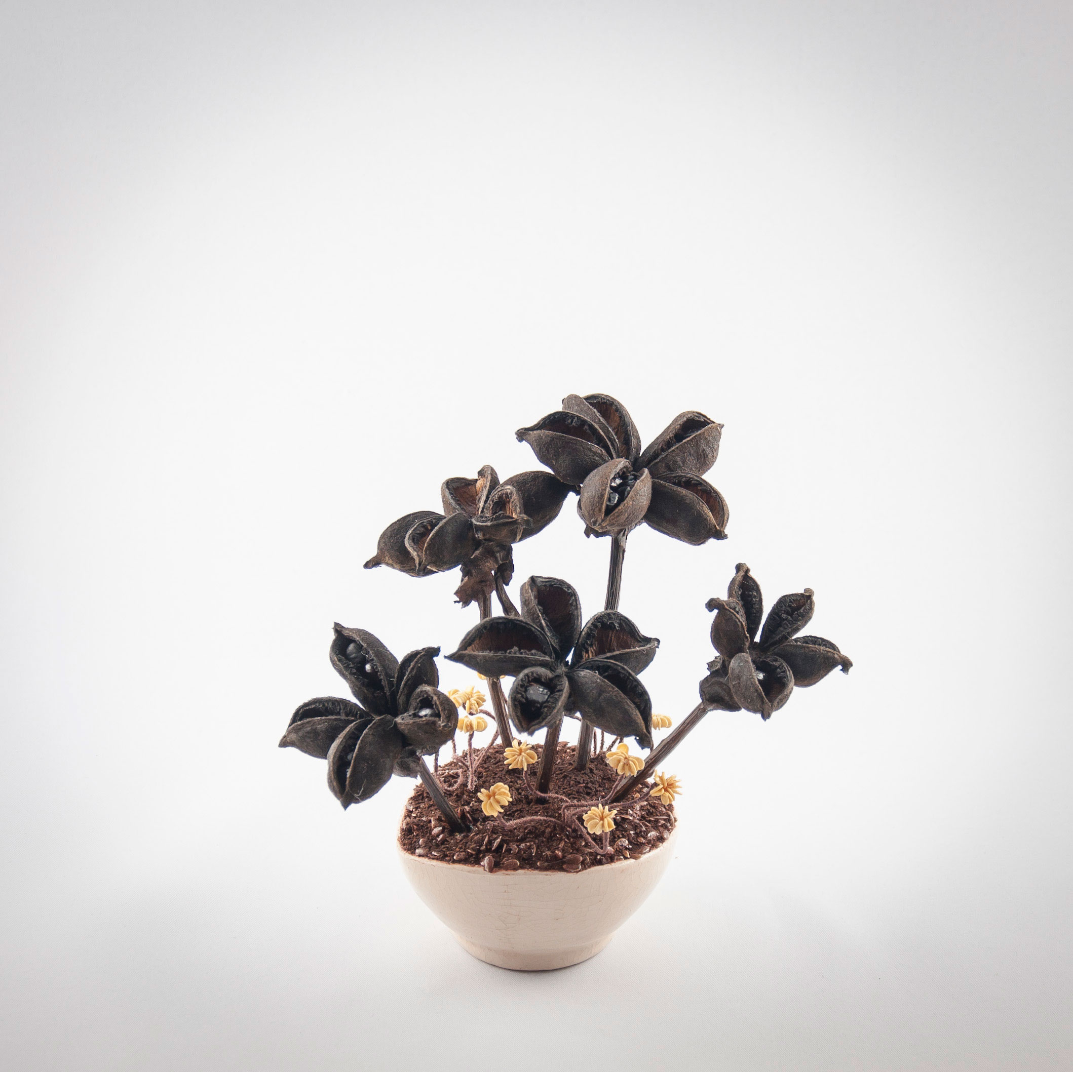 Dekoracyjny, spokojny bukiet, który ozdobi każdy stół. Elementy kompozycji rozmieściłam równomiernie wielkością i gatunkiem nasion. W górnej części kwiaty z płatków szyszki świerkowej i nasion…